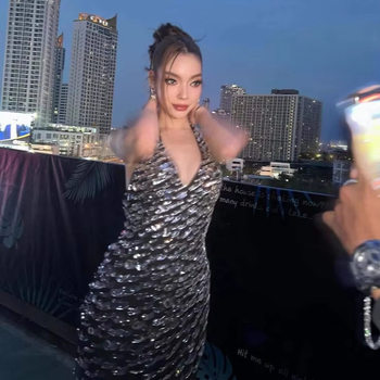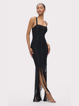 High-quality Fashion Black Diamond Strap Cocktail Dress Sleeveless Tassel Long Halter Dress